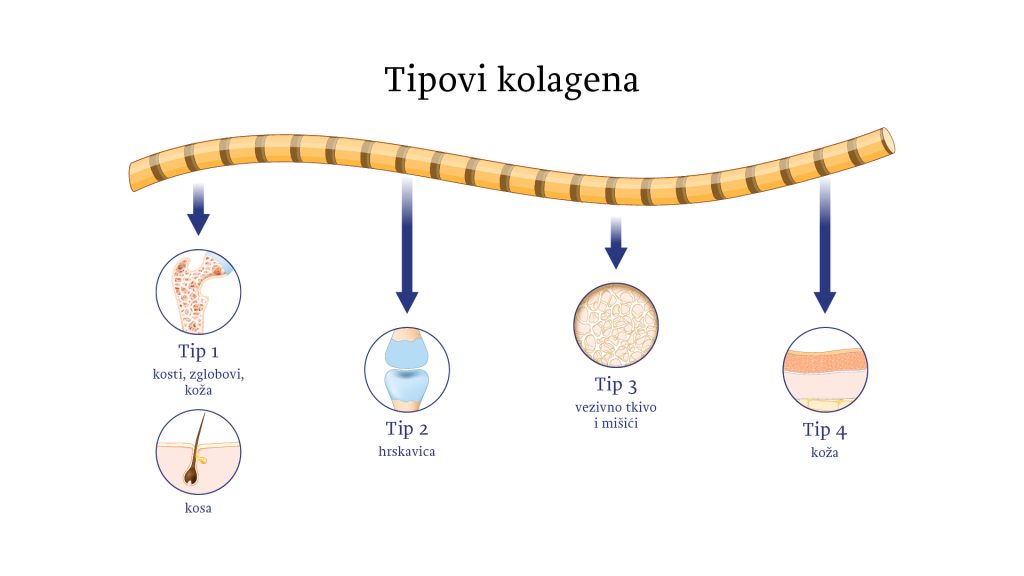1. Tip I – ovaj tip najzastupljeniji je u tijelu i čini oko 90% ukupnog kolagena. Nalazi se u koži, kostima, tetivama, ligamentima i drugim vezivnim tkivima. Njegova glavna funkcija je održavanje strukturalne čvrstoće kože i kostiju, čineći ih otpornijima na oštećenja.