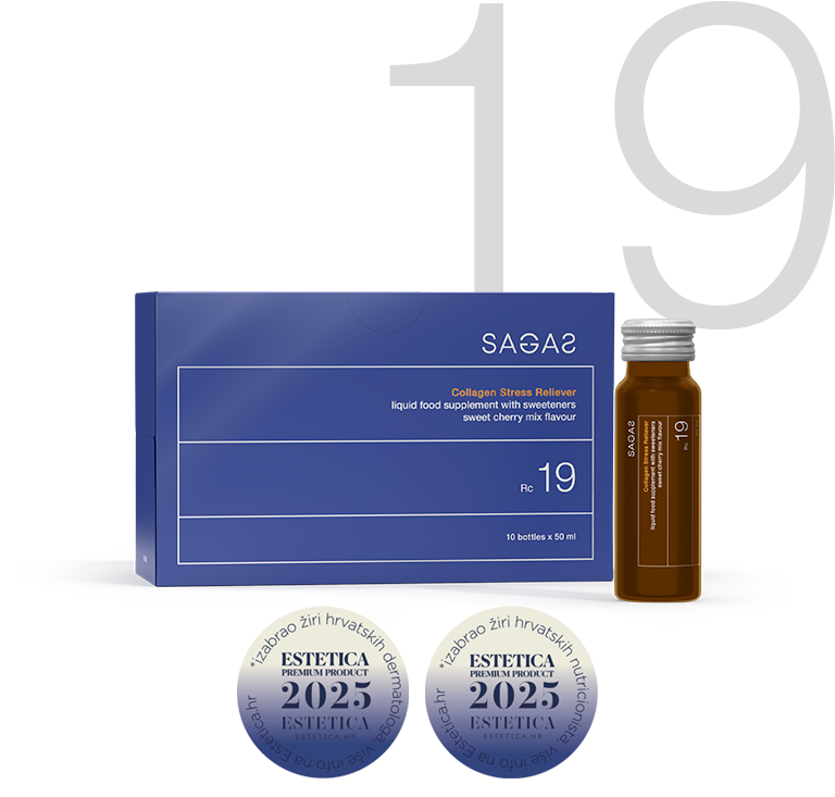 Sagas Rc 19 Collagen Stress Reliever je bez laktoze, orašastih plodova, glutena i GMO-a, a dolazi u pakiranju od 10 bočica po 50 ml.